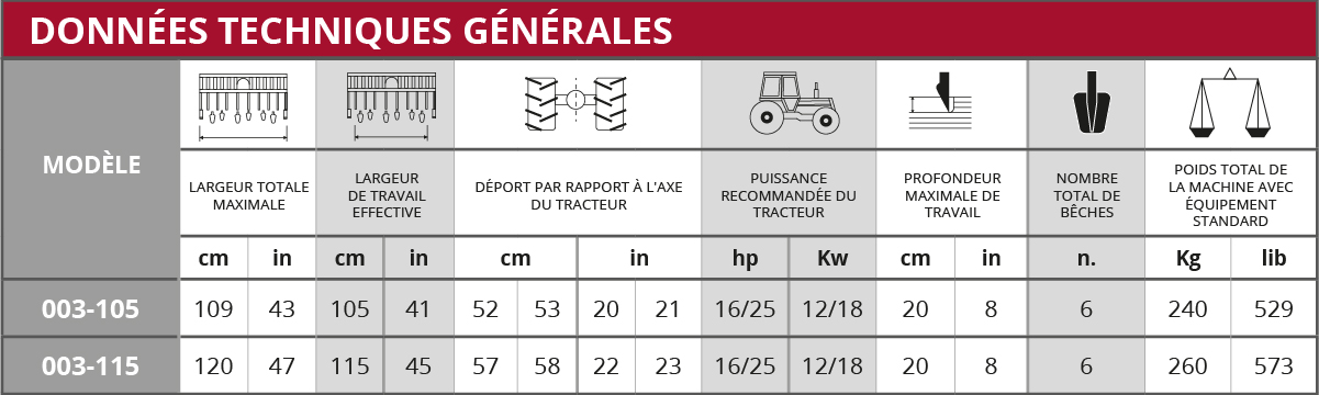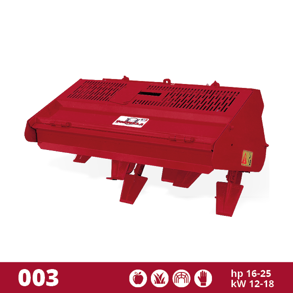 La série 003 comprend des rotobêches légères et compactes, adaptées aux petits tracteurs. Nos machines sont idéales pour travailler la terre en horticulture, pépinières, vignobles, jardinage, à usage privé, etc. Elles sont équipées d’une boîte de vitesses à 2 rapports et de glissières externes pour le réglage de la profondeur de travail.